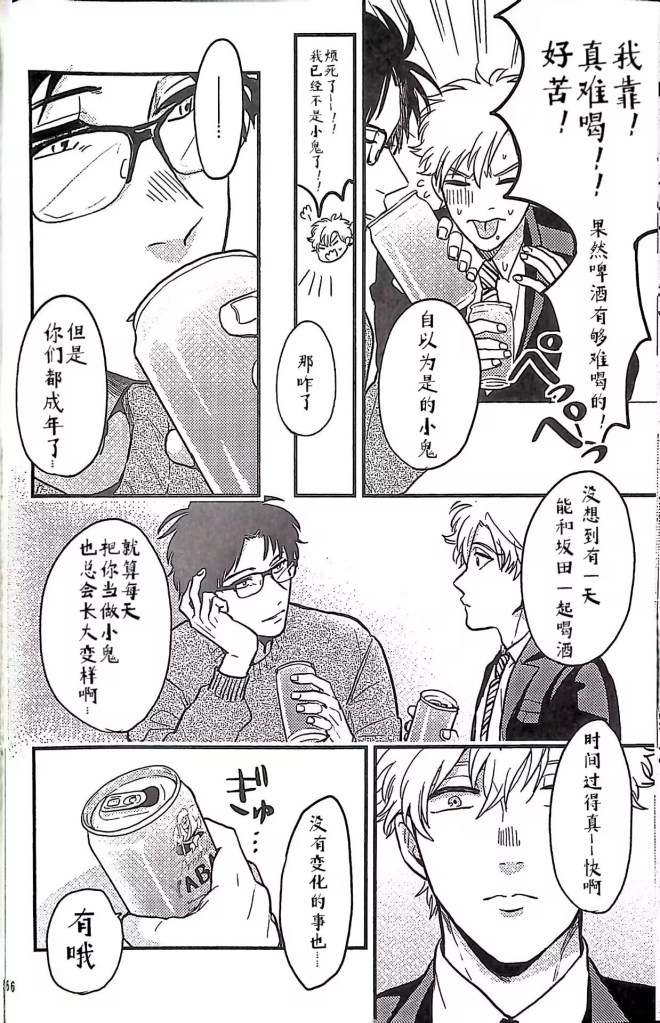 “那家伙是谁啊?”即使十四问了,喝醉的银时也没有回答很多。虽然曾想着跟已经不在的人比没什么必要,但某天夜晚在岸边,他看到银时对着一颗金色发光的球说话,便明白了那是银时最重要的存在,而他们之间没有让自己介入的余地。即便如此,他也不觉得难过,因为银时珍视并养育了自己,这就足够了。
