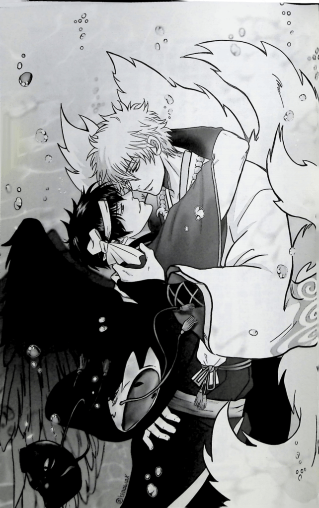 洞穴的尽头是一个用铁栅栏围起来的、让人毛骨悚然的牢房。里面好像有人倒下了,黑暗中隐约有东西在动。银时一瞬间想“银?”,然后便跑了过去,但用狐火照亮后出现的身影从体型上看不是孩子。是一个凄惨地倒在冰冷地上的人,仔细一看,他浑身是血,穿着破破烂烂的衣服,背后肩胛骨附近长着残破的翅膀,而且翅膀也被剪得很短,看样子再也无法飞翔了。定睛一看,翅膀、头发和穿着的装束全是黑色的,是一个和银时差不多身高的妖男。